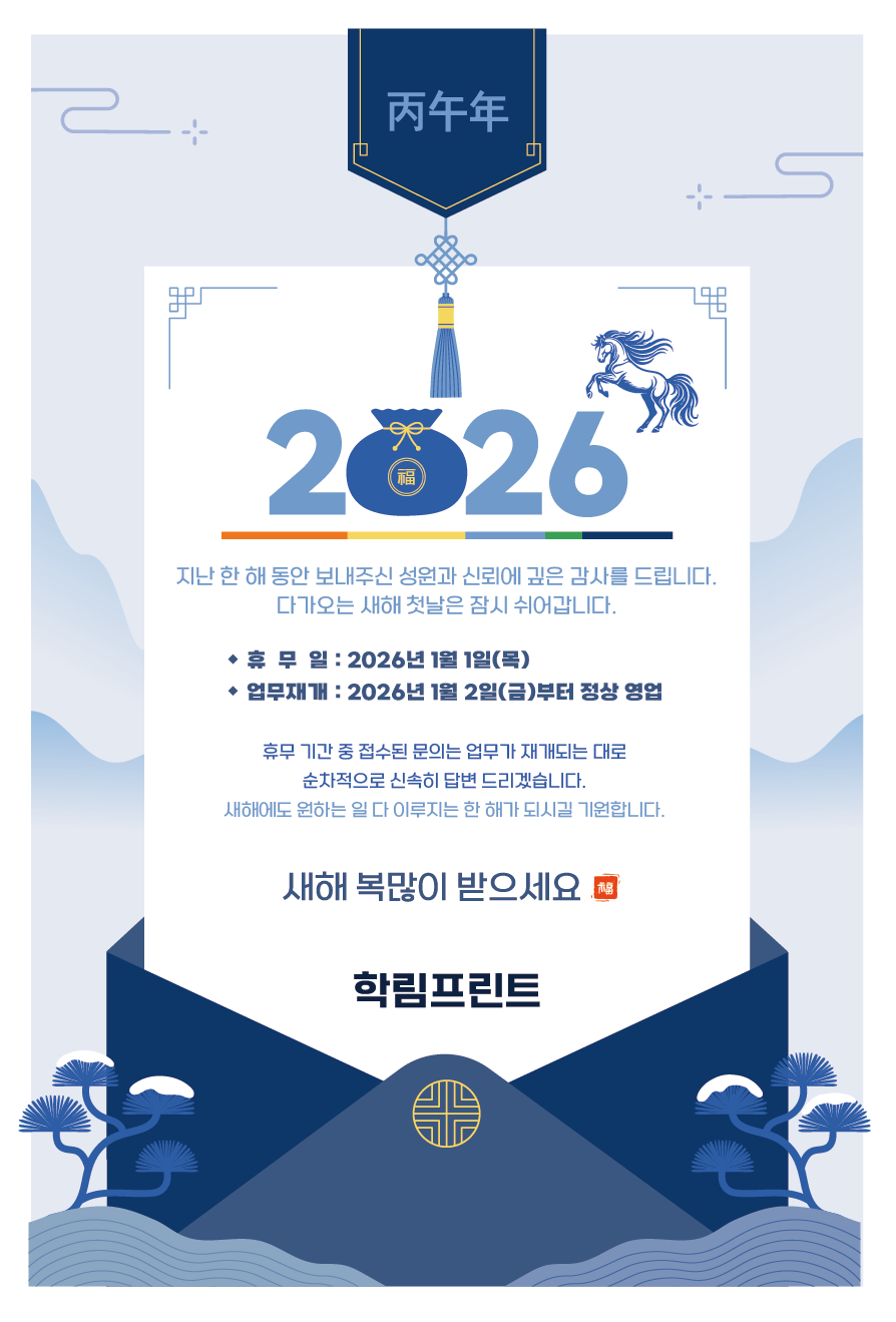 휴무 기간 중 접수된 문의는 업무가 재개되는 대로 순차적으로 신속히 답변 드리겠습니다. 새해에도 원하는 일 다 이루지는 한 해가 되시길 기원합니다.
